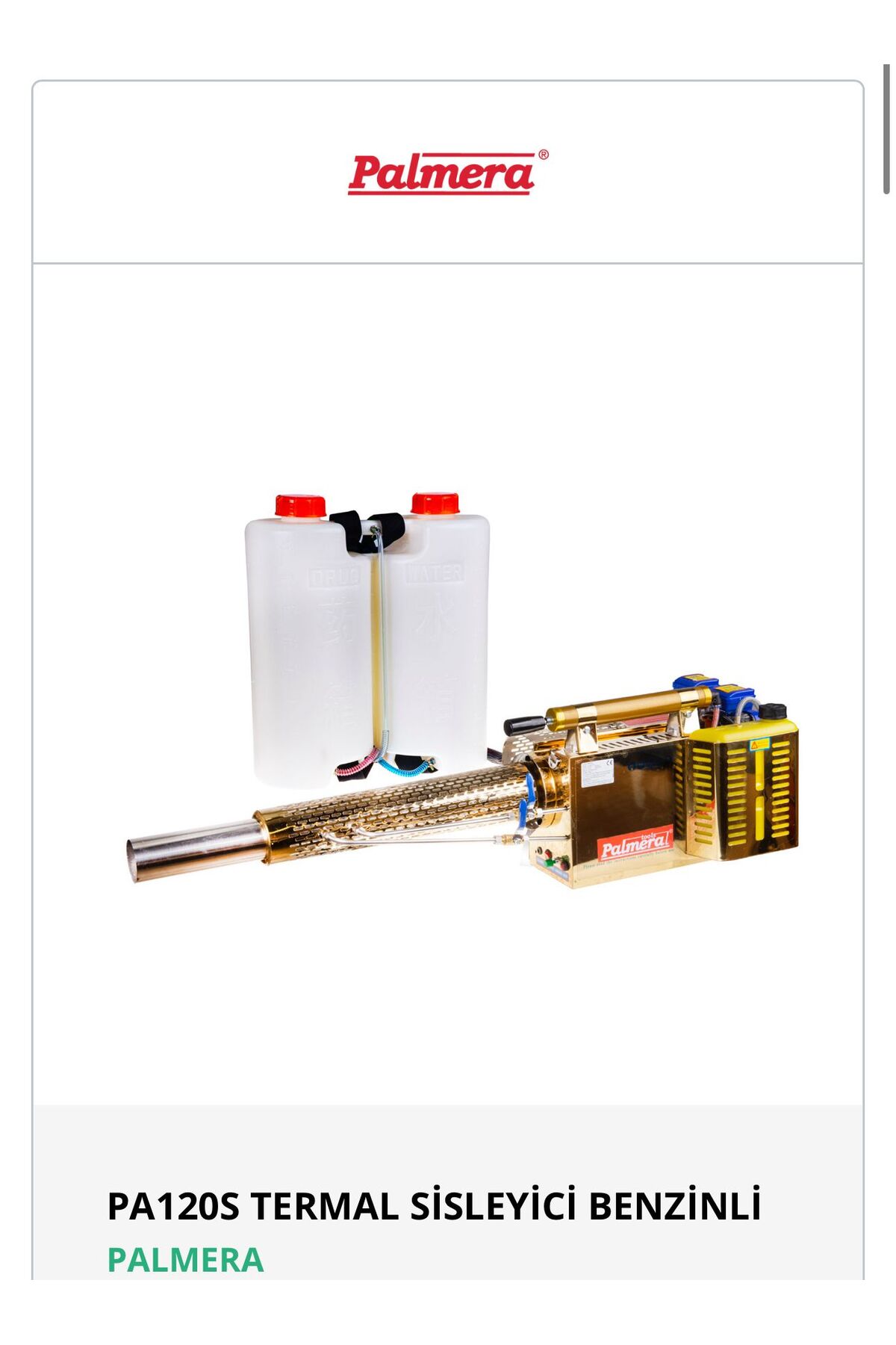 Palmera PA120S Termal Sisleme Makinesi, yüksek ısı ile mazot veya ilaç–yağ karışımlarını buharlaştırarak ince bir sis (fog) haline getiren, pulse jet motorlu profesyonel bir ilaçlama cihazıdır. Geniş seralar, meyve bahçeleri ve açık alanlarda zararlı mücadelesi ve don önleme amacıyla yaygın olarak kullanılır.